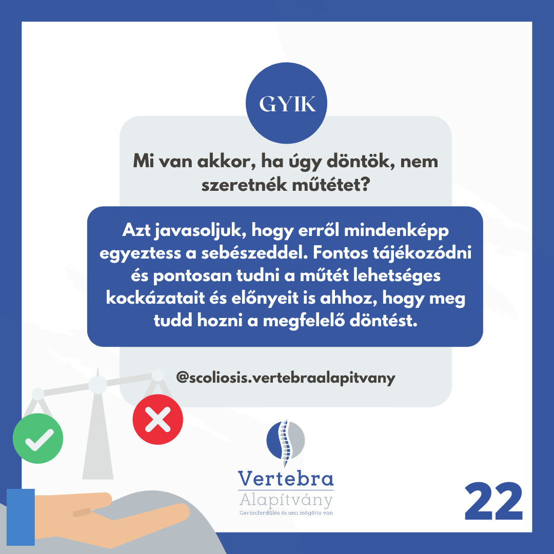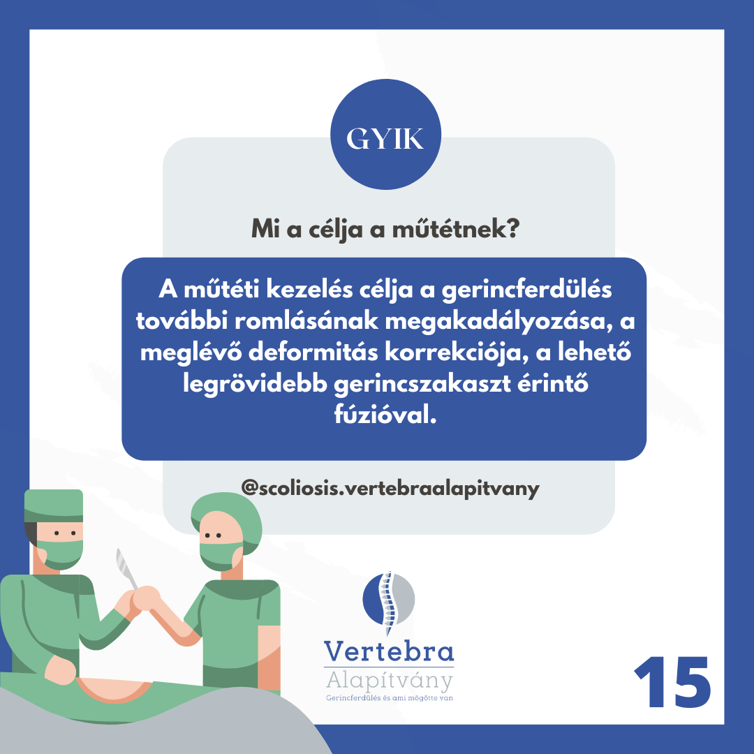 Műtéti kezelés indikációja- háti főgörbület esetén: 50 Cobb-foktól áll fenn, illetve ha a 40-50 Cobb-fok közötti görbület egyértelműen progrediál;